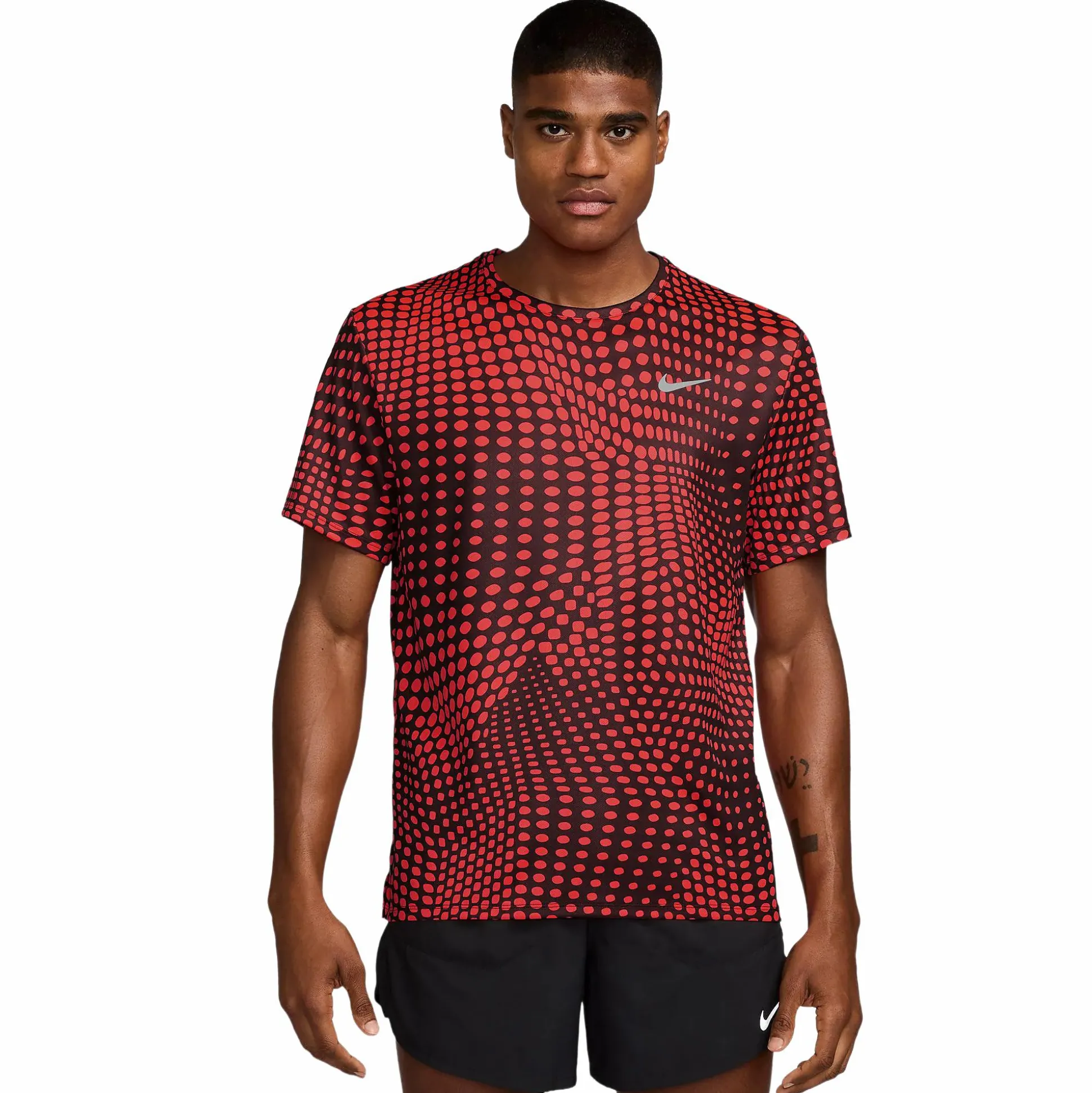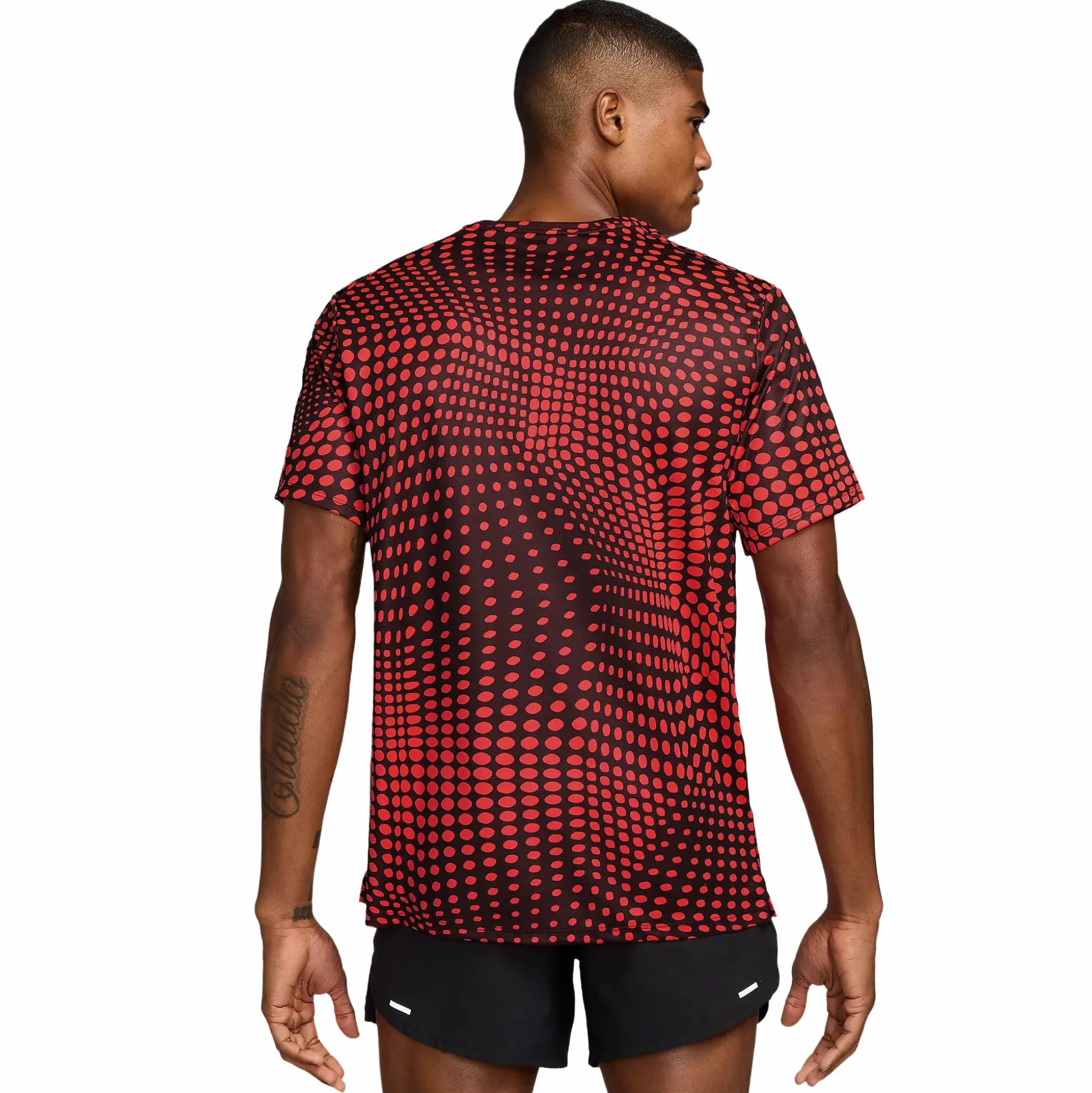 Nike Dri-FIT Miler Graphic SS Tee er en lett og funksjonell løpetrøye for herrer, utviklet for å holde deg tørr og komfortabel selv under intense økter. Det hurtigtørkende Dri-FIT-materialet transporterer effektivt bort svette fra huden, noe som gir en behagelig og tørr følelse gjennom hele løpeturen. T-skjorten er laget i et glatt og ultralett materiale som gir en avkjølende følelse mot huden og optimal bevegelsesfrihet.