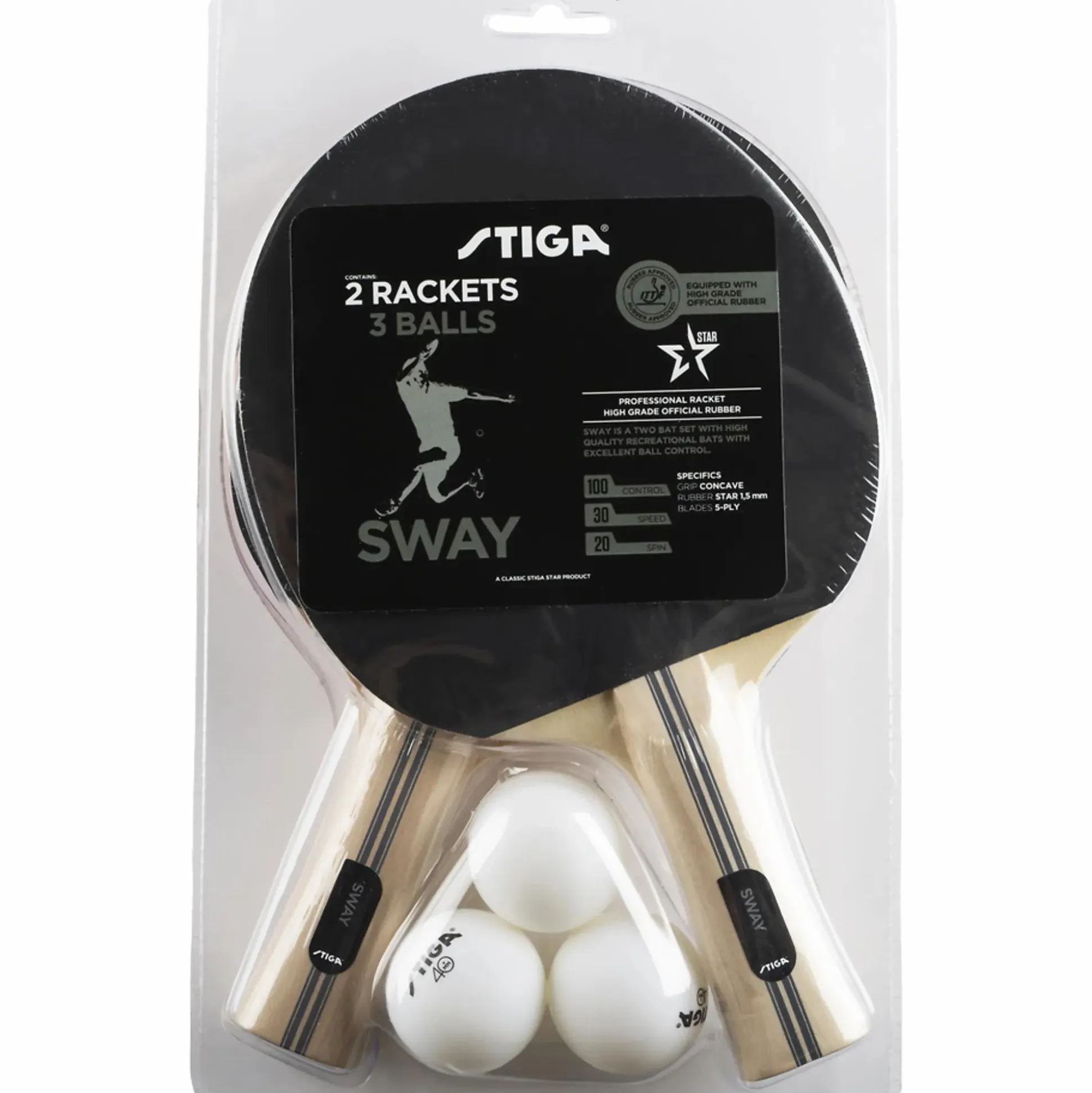 Et bordtennissett fra Stiga som består av to racketer og tre baller. Settet passer bra for nybegynnere samt for fritidsspill når du vil utfordre familie og venner til en kamp.