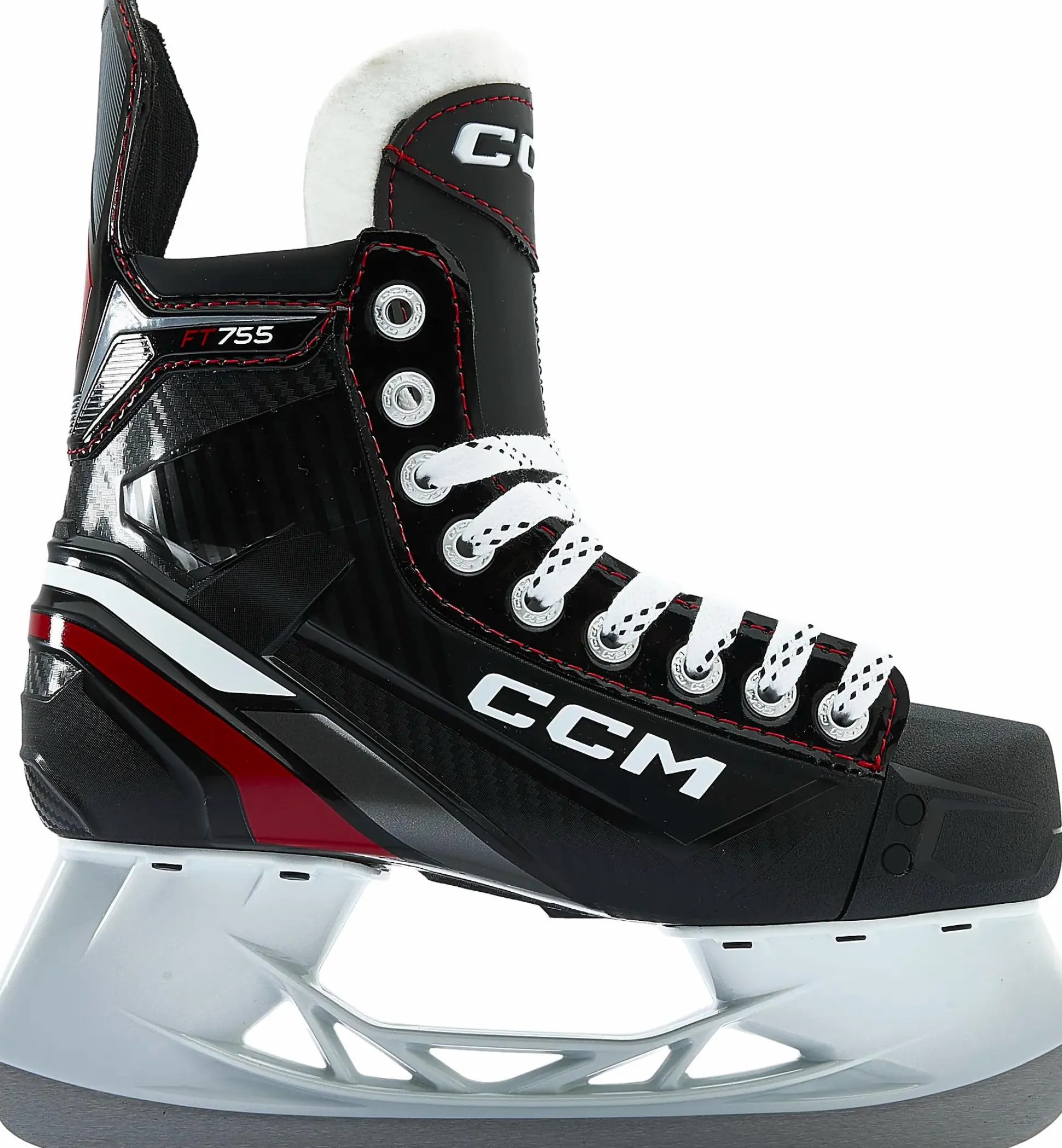 CCM SK 755 Intermediate hockeyskøyter er designet for yngre spillere som søker en god balanse mellom ytelse, komfort og slitestyrke. Skøytene er utviklet for å levere på isen uansett om det gjelder trening eller kamp. 2D quarter med karbonfiberpreget syntetisk skinn gir en lett og holdbar konstruksjon med ergonomisk passform som sitter tett rundt foten og gir støtte ved hvert skær. Innsiden er kledd med et HD-mikrofiberfôr sammen med et EVA-lag. Dette bidrar til økt komfort og en smidig følelse over hele foten. Skøytene er dessuten utstyrt med ADPT-ankelputer i memoryfoam som former seg etter fotens konturer og gir en stabil, tettsittende passform. Tungen er 7 mm tykk og har et lag av 3D-mesh som beskytter mot lacebite, noe som gir ekstra komfort og beskyttelse over vristen ved snøring.