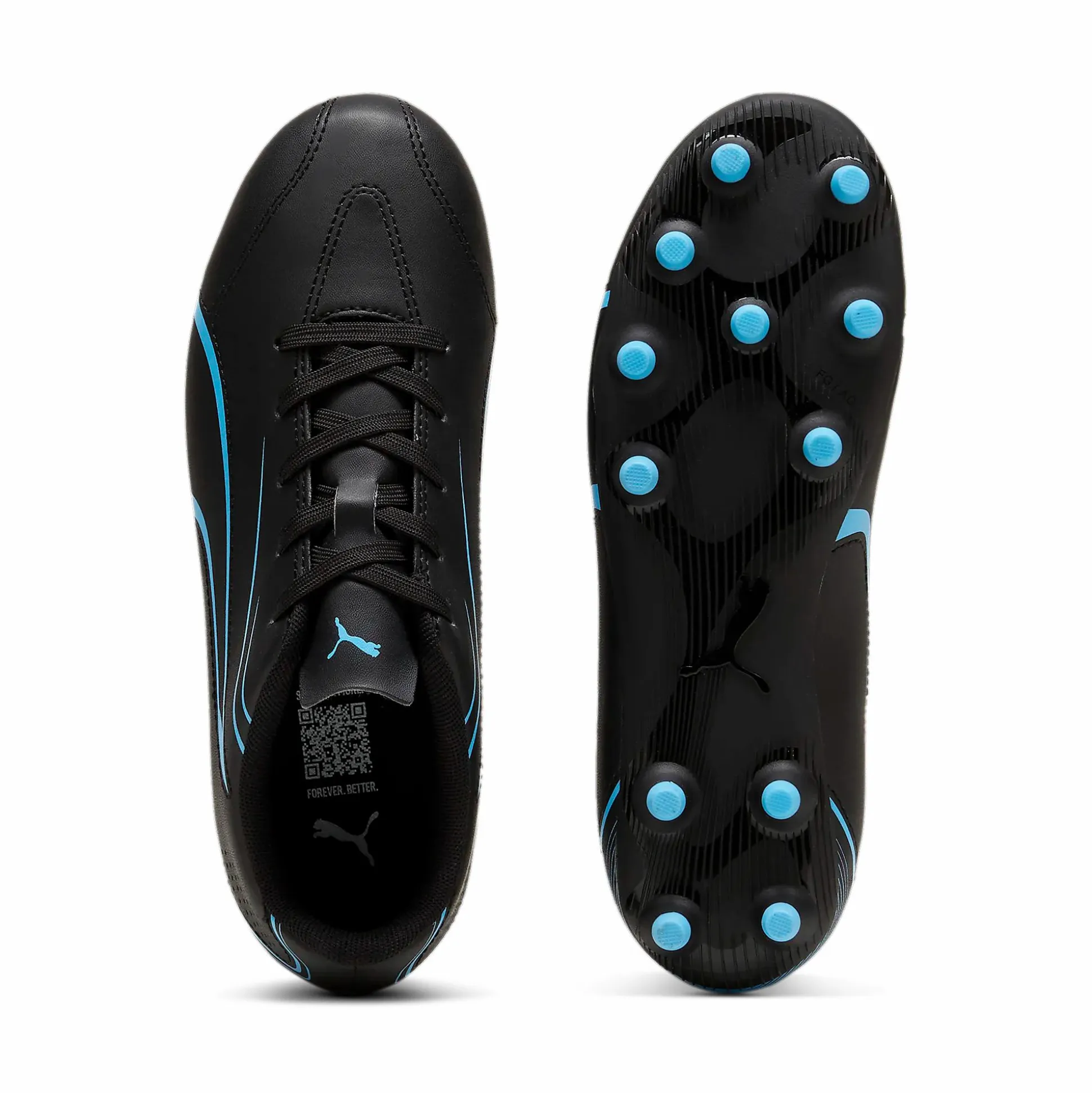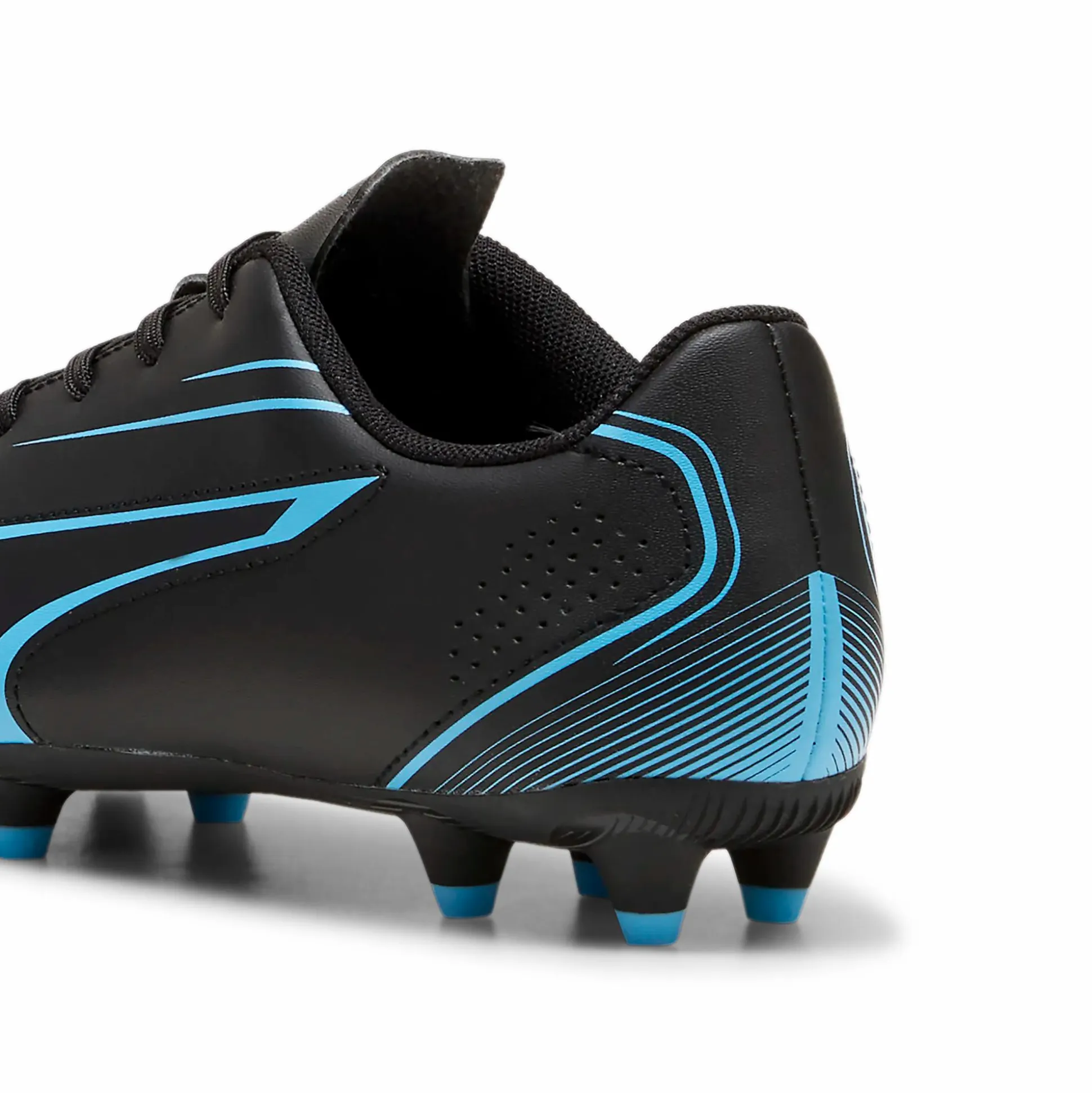 Puma Vitoria FG/AG JR har en myk overdel i syntetisk materiale som tilpasser seg fotens form og gir en omsluttende passform. Med den stabile yttersålen i TPU får du et sikkert grep når du skifter endring raskt og et godt driv fremover når du løper. Skoene passer til spill på både kunst- og naturgress.