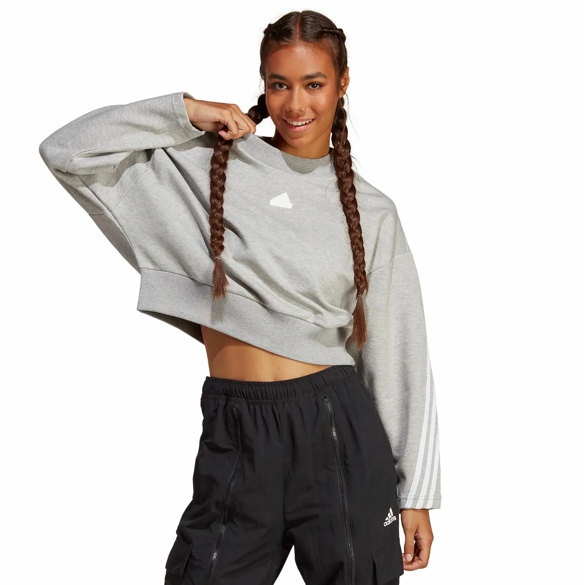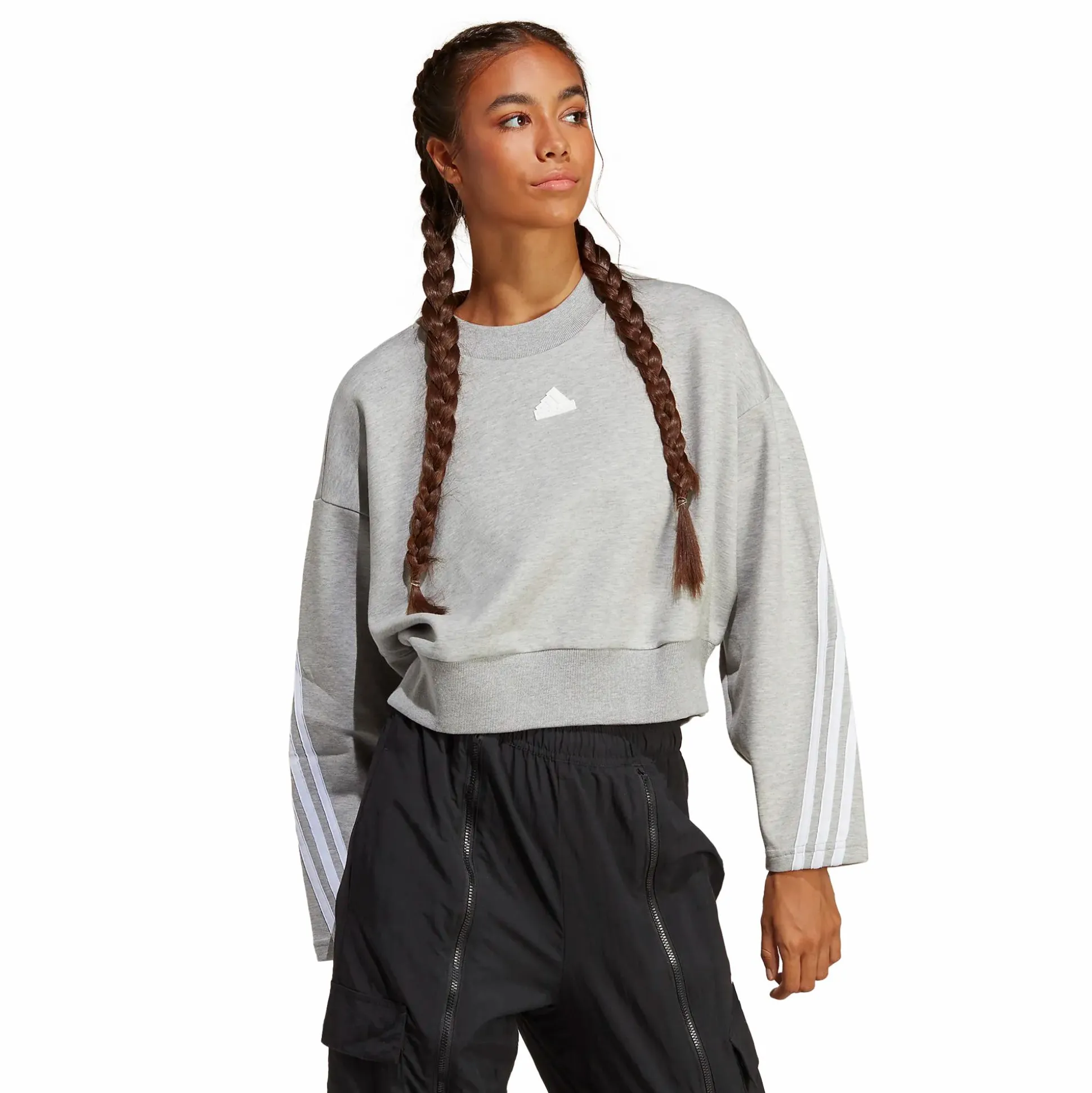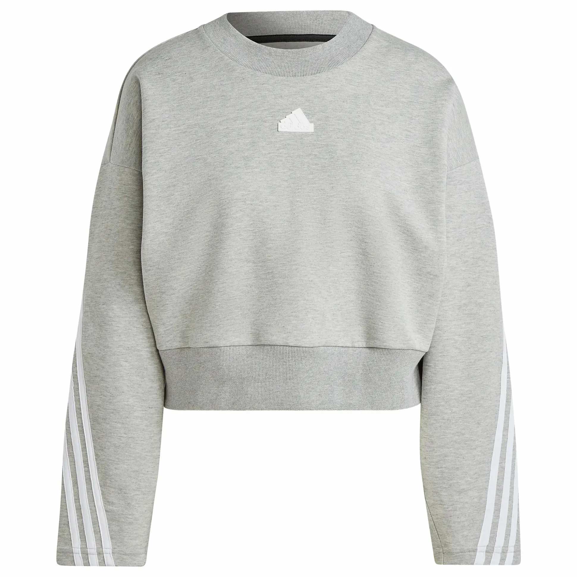 Future Icons 3-Stripes Sweatshirt er en trøye med en ledigere, behagelig passform i en croppet modell. Trøyen har en bred, elastisk snor i nederkant som er ribbestrikket, noe som gir den et mer sporty preg. Den har også ribbestrikket halsåpning.