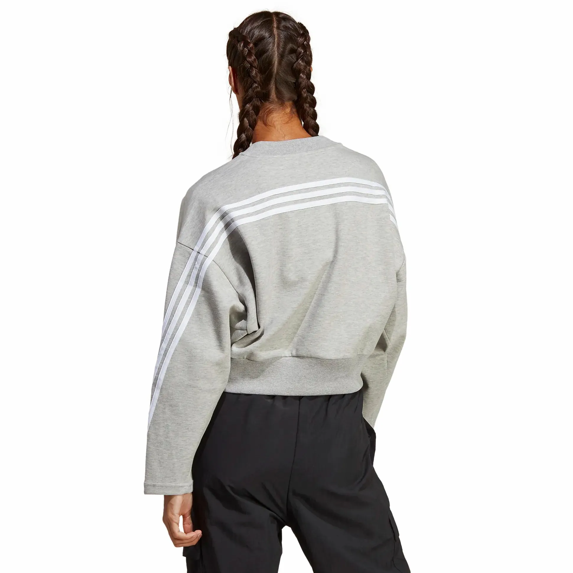 Future Icons 3-Stripes Sweatshirt er en trøye med en ledigere, behagelig passform i en croppet modell. Trøyen har en bred, elastisk snor i nederkant som er ribbestrikket, noe som gir den et mer sporty preg. Den har også ribbestrikket halsåpning.